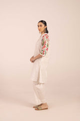 A classic-fit kurta features a band neckline with a front placket adorned in colorful stitching and subtle mukaish detailing. Sleeves are enhanced with vibrant gul bhaag embroidery and finished with delicate lace trim at the hems. Can be paired with any fits for chic look.