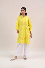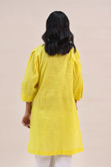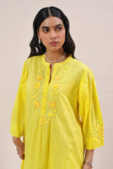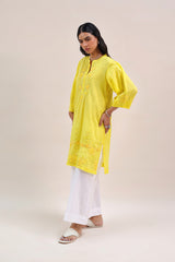 A handcrafted shirt with a round neckline and v slit adored with floral detailing on the placket. The shirt is adorned with applique and hand-embroidered accents, enhanced with delicate French knots. Finished with soft gathers on the sleeves. Can be paired with any Generation bottoms for a complete look.
