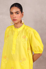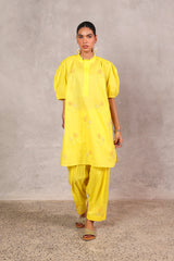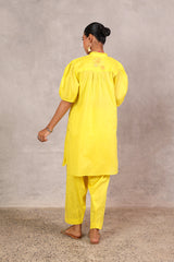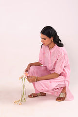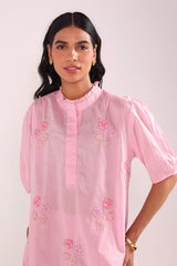 A handcrafted applique shirt featuring soft frill accents along the neckline. It showcases floral applique work with hand embroidery, delicate floral motifs at the back and gentle gathers that create a flared silhouette. Cinched sleeves add charm, Paired with an embroidered classic-fit shalwar for an effortlessly graceful look.
