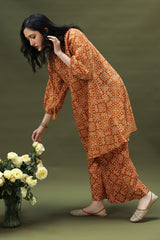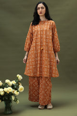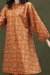 Classic-fit printed shirt with a round neckline and V-slit, adorned with tassel detailing. Cinched sleeve hems add subtle definition. Paired with matching printed culottes.
