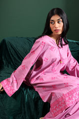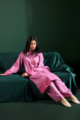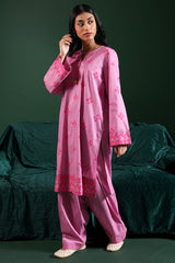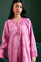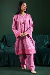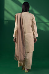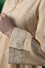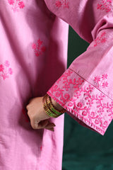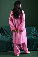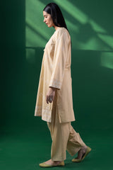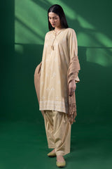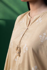 Embroidered A-line shirt with a low-band neckline and a V-slit, adorned with tassel detailing. The shirt is accentuated with embroidery along the sleeve hems and border. Paired with a khula poncha shalwar, finished with stitching along the ankle hemline.