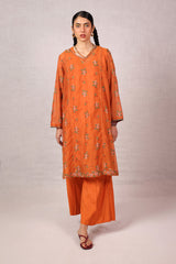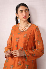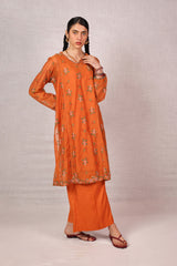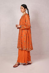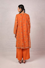 A formal, embroidered paneled shirt featuring a round neckline enhanced with delicate embroidery. Criss-cross stitched floral motifs adorn the shirt, creating a harmonious design. Subtle embroidery graces the sleeve hems and panels, while the border is elevated with fine gul-boti detailing. Paired with culottes, this ensemble blends refinement with understated charm.