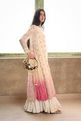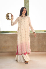 Crafted with moonlight sight, a formal loose-fit straight kurta features a boat neckline, accentuated with delicate stitching details. The kurta is adorned with gul motifs in a blend of vibrant and pastel hues. The side slits and sleeve hems are beautifully enhanced with delicate embroidered details and sequin work. Side tassels add an aesthetic touch to the overall design. The kurta is further enhanced by a softly shaded, dyed crinkle inner, adding depth and elegance, completing the look.