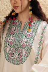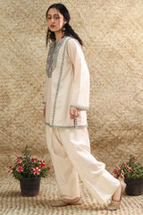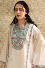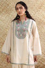Embroidered paneled kurti designed in a relaxed silhouette, adorned with a richly detailed multicolour embroidered panel along the neckline, while the wide sleeves and hem are finished with coordinating embroidered borders. Style it with your preferred Generation bottoms.