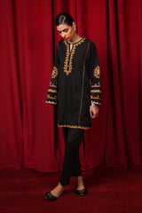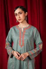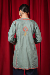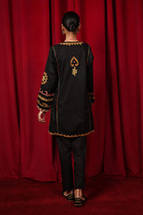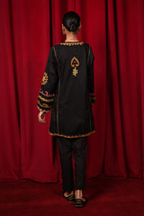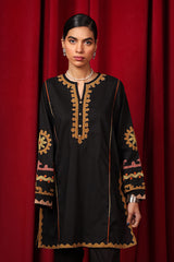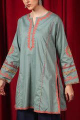 A paneled-fit kurta crafted with a round neckline, V-slit, and buttoned placket. It features applique work on the neckline, sleeves, and side slits, with a motif on the back. The panels are finished with color-detailed piping for added elegance.