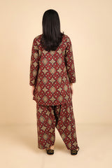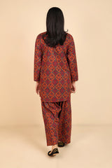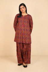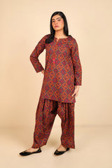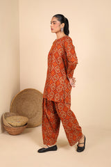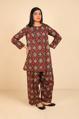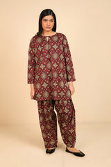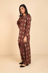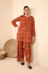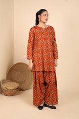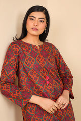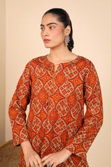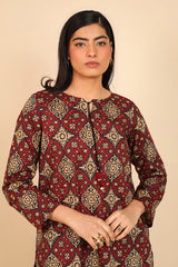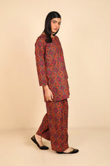 Ajrak-Inspired suit featuring a mid-length printed kurti crafted in authentic design. The classic key hole on neckline with tassel embellishment adds a modern twist.Paired with classic pegged trousers.