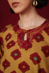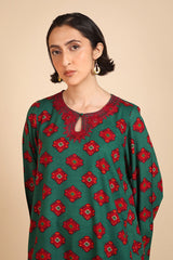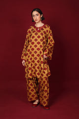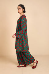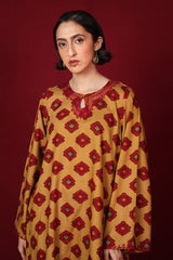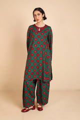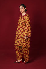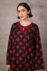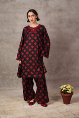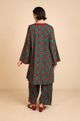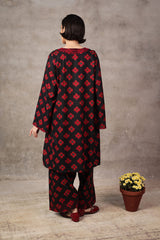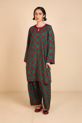 A loose-fit, printed kurta with round neckline featuring detailed embroidery on keyhole and neckline, and on sleeves hem. Paired with classic loose-fit shalwar.