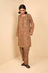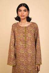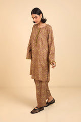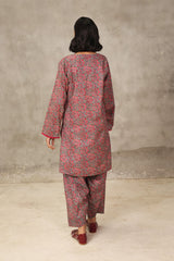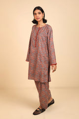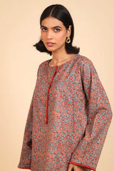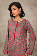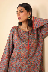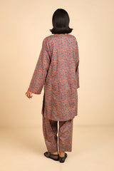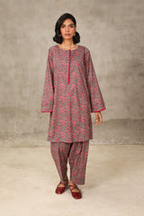 A loose fit printed shirt with round neckline, featuring buttons along the front placket. Paired with a matching printed shalwar.