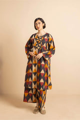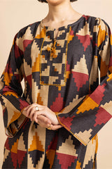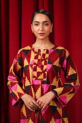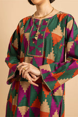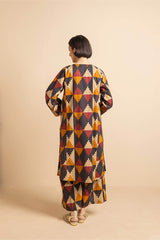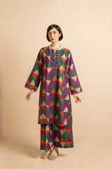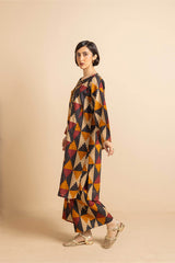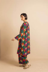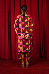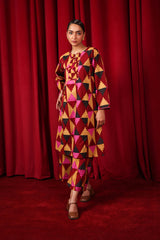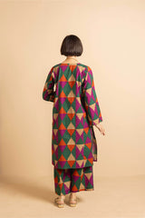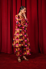 Straight-cut printed kurta adnored with round neckline and v-slit, enhanced by subtle embroidery on sleeves hem and neck embellished by tassal. Paired with matching printed wide-leg Trousers.