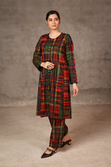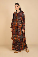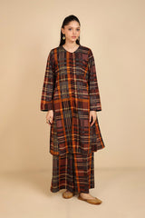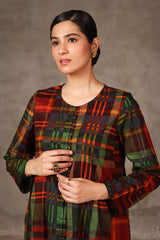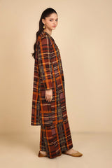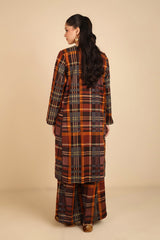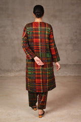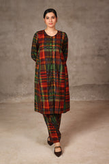 A loose fit printed flared kurta with buttons detailing along the front. Paired with matching printed culottes.