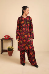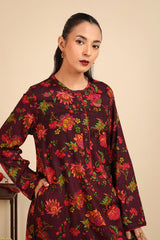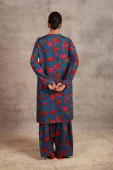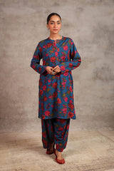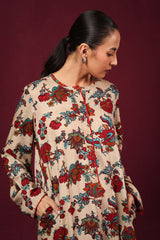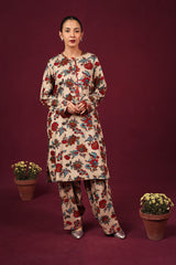 Floral printed kurta featuring round neckline and v-slit adorned with pipping detail on neckline and sleeve hems. Paired with printed loose-fit shalwar along with running stitches around anklets.