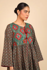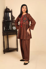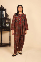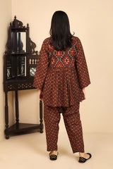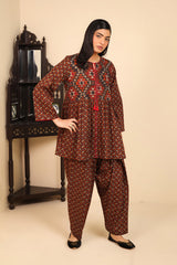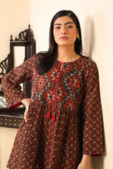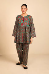 A classic printed frock inspired by ikat pattern giving all cultural vibe, enhanced by tassals on round neckline, v slit and gathers on the waist. Ribbon trims on neckline and sleeve hem. Paired with matching pegged shalwar.