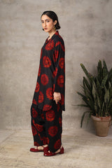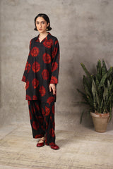 A loose-fit printed kurta in vibrant colours, featuring collar neckline and round shirt hem. Paired with coordinated shalwar.