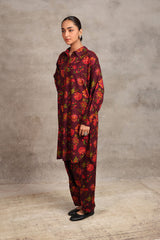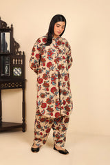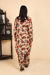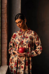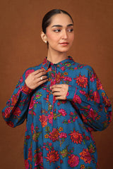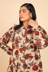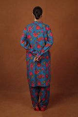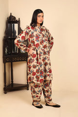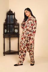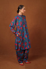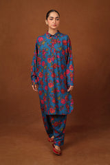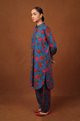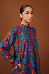 A chic floral printed loose straight-cut kurta with collor neckline and placket with buttons on it followed by ribbon pipping.Another detail to be noted is cuff sleeves and round style shirt hem which gives classy vibe .Teamed with loose printed shalwar.
