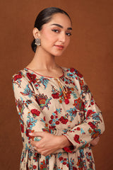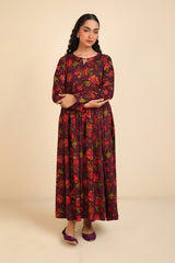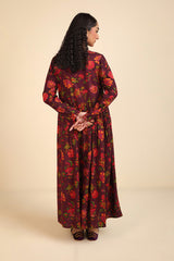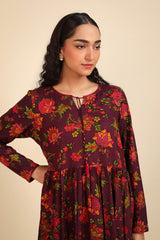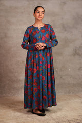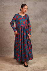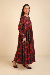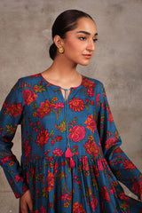 chintz printed long, flared frock featuring round neckline, embellished with tassel and pipping.Gathers around waist gives the perfect flow.
