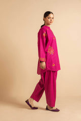 This suit features a medium length a-line kurti with a band collor and a placket, subtly detailed with embroidery. This kurti is adnorned with a vibrant cluster of flowers and intricate embroidery on the sleeves boarders. Paired with pegged shalwar.
