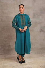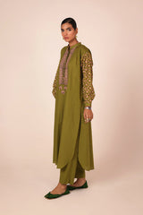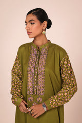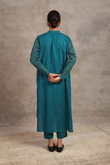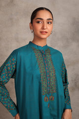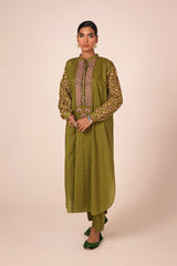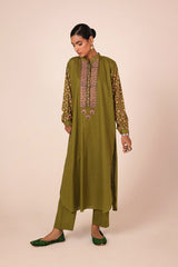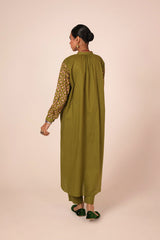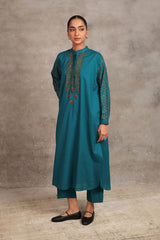 Handcrafted- A classic loose-fit solid colour kurta with band neckline featuring hand stitching details around it The Kurta highlights the traditional hand-block printing in muted tones on button line and on cinched sleeves. Paired with classic-fit trousers.
