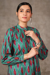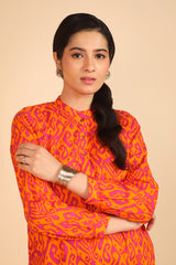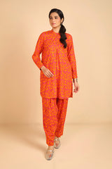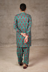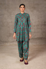 An ikat-inspired, medium-length printed shirt with band neckline and buttons on planket. Another detail includes straight-cuff sleeves. Paired with matching fit shalwar.