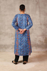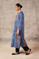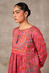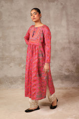 Jigsaw Printed long frock featuring key hole round neckline with embellishment of tassels and buttons. Little piping details on the sleeve hem and gathers around the body.