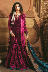 Richly crafted luxurious velvet shirt adorned with delicate embroidery, enhanced with gota and sequin detailing along the neckline and sleeve hems. Paired with a generously flared gharara, finished with dual-tone velvet hem detailing for a truly statement, festive-ready look.