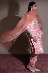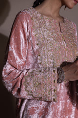 Luxurious velvet shirt adorned with delicate embroidery, enhanced with gota detailing on the bodice and sleeve hems. Paired with a velvet pegged shalwar and styled with an organza dupatta finished with gota lace and tassel detailing for a festive statement look.