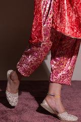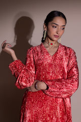 Velvet printed shirt with a V-shaped back keyhole detail. Delicate gota lace accents trace the slits and hem, adding a graceful touch. Paired with a coordinated printed velvet pegged shalwar for a classic festive statement look.