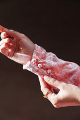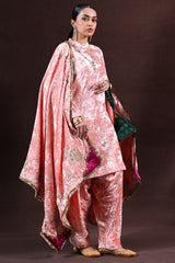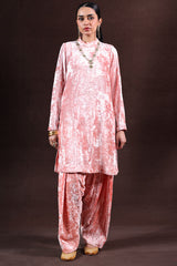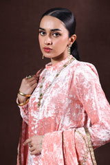 Luxurious velvet shirt featuring a band neckline with a back slit, finished with button accents along the neckline and sleeve hems. Paired with a classic-fit velvet shalwar detailed with fine stitching along the ankle hemline.