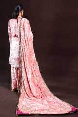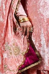 Velvet shawl crafted in a rich deep tone featuring an intricately embellished border with fine embroidery, sequins, and gota detailing. Finished with kiran lace for an elegant festive touch.