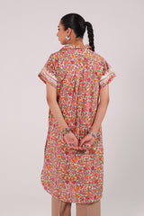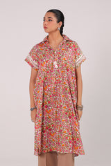 A printed loose-fit shirt with a collared neckline and playful tassel detailing. Designed with drop shoulders and turned-up sleeves adorned with lace accents. Back pleats add a soft, flowy silhouette.