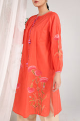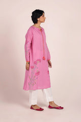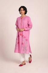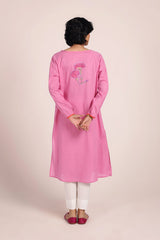 A classic-fit handcrafted kurta with a round neckline and V-slit, featuring playful tassel details. Delicate hand-embroidered signature blooming stems adorn the bodice and sleeves, complemented by a statement floral motif at the back. Cinched sleeves finish with vibrant hems. It pairs perfectly with Generation lowers for a soft, artistic look.