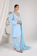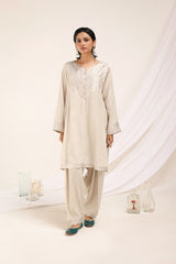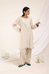 A classic fit kurta featuring a round neckline with a V-slit, enriched with intricate gota embellishments. The bodice showcases a refined gota pattern, while the sleeve hems shimmer with a luminous gota glow design. Soft pleats on the shoulders add structure. The side slits and shirt hem are adorned with delicate gota detailing. Paired with a classic shalwar featuring gota lace on the ankle hem.
