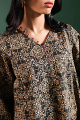 A relaxed-fit printed shirt with a V-neckline adorned with loop details and a rounded hem. Paired with matching printed classic-fit shalwar for a coordinated look.