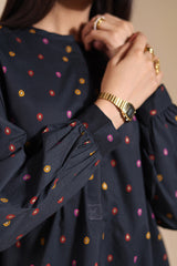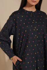 A loose-fit printed shirt with a round neckline and buttons along the front placket, adorned with gold print for a refined touch. It features cuffed sleeves, soft pleated detailing at the back, and side pockets for functionality and ease. Paired with matching printed classic-fit shalwar for a coordinated, stylish look.