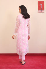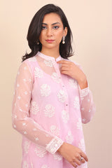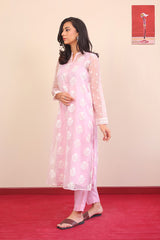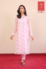 Straight fit organza shirt with embroidery motifs all over, paired woth PK Rawsilk lowers and a cotton silk shameez.