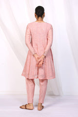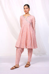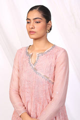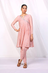 A short peplum shirt with embroidery on net, boat neckline with dip, long fitted sleeves and paired with embroidered net pegged shalwar.