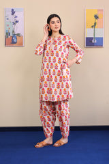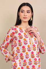Short printed loose-fit shirt with side pockets with fabric detailing on sleeves and neckline. Full length sleeves and round neckline with buttoned placket. Paired with matching printed shalwar.