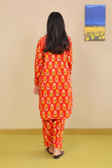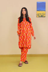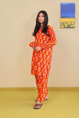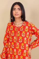 Printed round hem shirt with fabric detailing on cuffed sleeves and round neckline with placket. Paired with matching classic shalwar.
