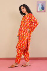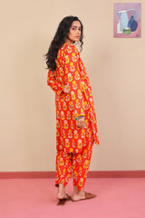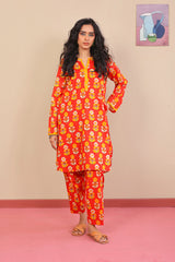 Long printed tunic with side pockets with fabric and stitch details on pocket, sleeves and neckline. Full length sleeves and round neckline with round neckline with V dip and buttons on placket. Paired with matching shalwar.