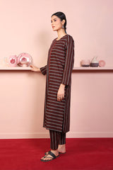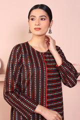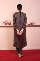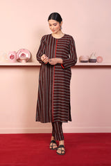 Print-blocked front slit long shirt highlighted with contrasting edging. Full length sleeves and round neckline with buttoned V-dip. Paired with matching printed trouser.
