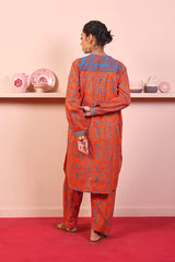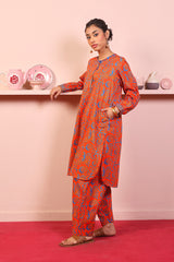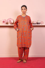 A long printed shirt with crew neckline and buttons on placket, full cuffed sleeves with pleats on back. Paired with a matching shalwar.