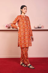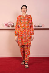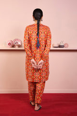 Printed short round hem shirt with contrasting edging, cuffed sleeves and round neckline with placket. Paired with matching shalwar.