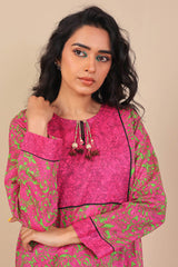 Printed A-line shirt with side pockets and contrasting fabric detailing on staight sleeves and round neckline with buttons and tassels. Paired with matching slim-fit trousers.