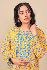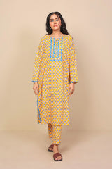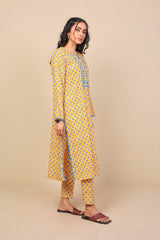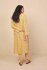 Print blocked shirt with fabric strip details on sleeves, neckline and sides. Straight full length sleeves and round neckline with V-dip. Paired with printed straight fit trouser.