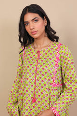 Printed A-line shirt with gathering on sides, fabric strips on sleeves and shoulders. Round neckline with tassel dori closure. Paired with printed shalwar.