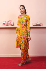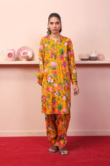 The ultimate spring outfit! A bright and effervescent explosion of florals all over the kameez with a notched neckline detail, paired with a matching shalwar.