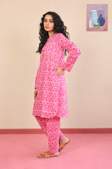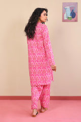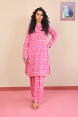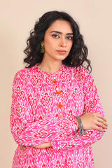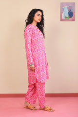 Printed round hem shirt with side pockets, cuffed sleeves and round neckline with tassels. Paired with printed shalwar.