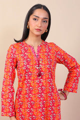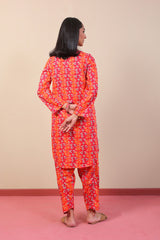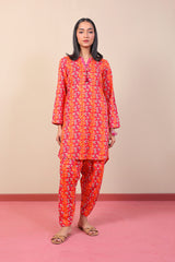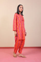 Colourful printed shirt with tassel details on neckline, paired with matching printed shalwar.