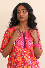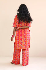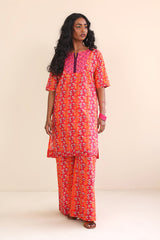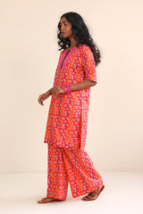 A block print shirt with half sleeves, round neck with dip, paired with flary bell bottom culottes.
