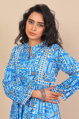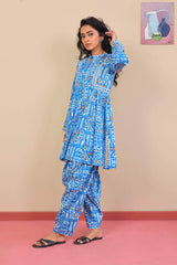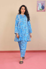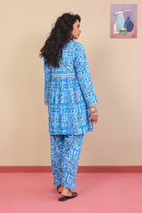 Printed flared shirt with fabric detailing all over, full length sleeves and round neckline with V dip. Paired with matching shalwar.