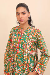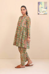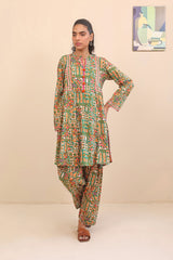 Printed flared frock with side gathers and tassels on neckline, paired with classic fit printed shalwar.